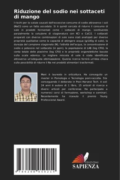 I rischi per la salute causati dall'eccessivo consumo di sodio attraverso i sali (NaCl) sono un fatto assodato. Si è quindi cercato di ridurre il consumo di sale in prodotti fermentati come i sottaceti di mango, sostituendo parzialmente la soluzione di stagionatura con KCl e CaCl2. I sottaceti preparati con diverse combinazioni di sale sono stati analizzati per diverse proprietà qualitative come la capacità di attingere acqua (g/100g di sale), la durezza del campione stagionato (N), l'attività dell'acqua, la concentrazione di sodio e potassio nel sottaceto (in ppm), la popolazione di LAB (log CFU), la conta totale delle piastrine (log CFU) e le proprietà organolettiche basate sulla scala edonica. La migliore miscela di sale è stata identificata attraverso un'adeguata ottimizzazione. Questa ricerca fornirà un'idea chiara sulla possibilità di ridurre il Na nei prodotti alimentari trasformati.