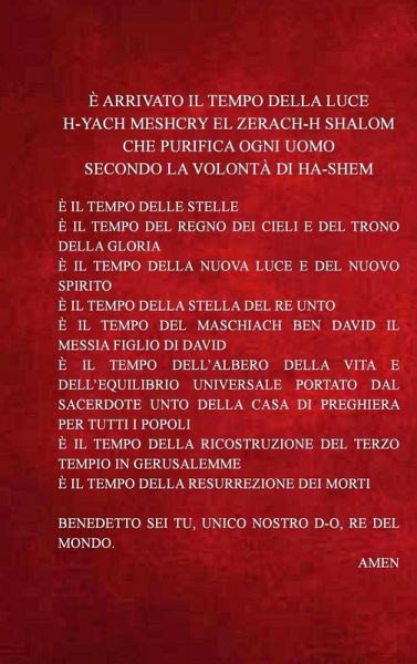 Nella Missione del Sacerdote Unto e Principe della Pace, la Missione Messianica che ha il Permesso di Mosè Nostro Maestro e l'Autorità del Profeta Elia, scendono i Segni Completi della Terza Redenzione Finale per Israele e le Nazioni. I Segni Completi sono: il Segno Generale E' Arrivato il Tempo Ba Ha-Sman il Segno delle Stelle il Segno del Regno dei Cieli il Segno della Nuova Luce e del Nuovo Spirito il Segno della Stella di Cristo (conosciuta come la Stella del Re Unto) il Segno della Redenzione, Segno della Quarta Generazione e Segno della Ricostruzione del Terzo Tempio in Gerusalemme il Segno dello Tzadik Risorto (Segno della Resurrezione dei morti). Il Messia deve compiere la sua Missione con Segni fatti da lui apertamente e segnalati da altri per testimonianza.