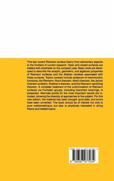This text covers Riemann surface theory from elementary aspects to the fontiers of current research. Open and closed surfaces are treated with emphasis on the compact case. Basic tools are developed to describe the analytic, geometric, and algebraic properties of Riemann surfaces and the Abelian varities associated with these surfaces. Topics covered include existence of meromorphic functions, the Riemann -Roch theorem, Abel's theorem, the Jacobi inversion problem, Noether's theorem, and the Riemann vanishing theorem. A complete treatment of the uniformization of Riemann sufaces via Fuchsian groups, including branched coverings, is presented. Alternate proofs for the most important results are included, showing the diversity of approaches to the subject. For this new edition, the material has been brought up- to-date, and erros have been corrected. The book should be of interest not only to pure mathematicians, but also to physicists interested in string theory and related topics.