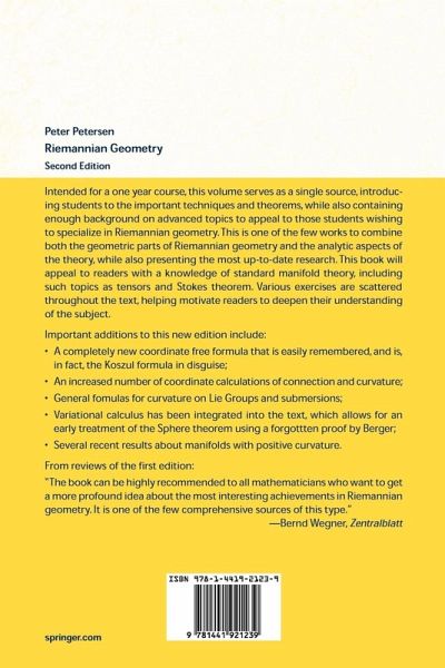 "This is an introduction to modern methods in Riemannian geometry containing interesting and original approaches to many areas in this field. ... After a general introduction (metrics, curvature, geodesics) and concrete calculations for many examples, the second half of the book considers Bochner-Cartan techniques and comparison geometry. Particularly for these aspects it continues to play an outstanding role among textbooks in Riemannian geometry." (M. Kunzinger, Monatshefte für Mathematik, Vol. 154 (1), May, 2008)