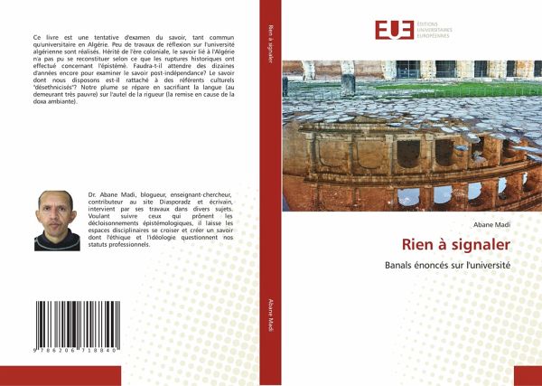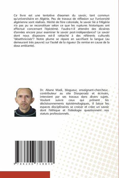 Ce livre est une tentative d'examen du savoir, tant commun qu'universitaire en Algérie. Peu de travaux de réflexion sur l'université algérienne sont réalisés. Hérité de l'ère coloniale, le savoir lié à l'Algérie n'a pas pu se reconstituer selon ce que les ruptures historiques ont effectué concernant l'épistémè. Faudra-t-il attendre des dizaines d'années encore pour examiner le savoir post-indépendance? Le savoir dont nous disposons est-il rattaché à des référents culturels "désethnicisés"? Notre plume se répare en sacrifiant la langue (au demeurant très pauvre) sur l'autel de la rigueur (la remise en cause de la doxa ambiante).