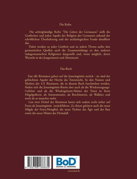 Die ReiheDie achtzigbändige Reihe "Die Götter der Germanen" stellt die Gottheiten und jeden Aspekt der Religion der Germanen anhand der schriftlichen Überlieferung und der archäologischen Funde detailliert dar.Dabei werden zu jeder Gottheit und zu jedem Thema außer den germanischen Quellen auch die Zusammenhänge zu den anderen indogermanischen Religionen dargestellt und, wenn möglich, deren Wurzeln in der Jungsteinzeit und Altsteinzeit.Das BuchFast alle Riesinnen gehen auf die Jenseitsgöttin zurück - sie sind der gefürchtete Aspekt der Herrin des Totenreichs. In den Namen und Mythen der 121 Riesinnen, die in diesem Buch beschrieben werden, finden sich die Jenseitsgöttin-Riesin aber auch als die Wiederzeugungs-Geliebte und als die Wiedergeburts-Mutter der Toten in ihren Hügelgräbern, als Sonnenmutter, als Beschützerin, als Walküre und noch als so manches mehr.Gut zwei Drittel der Riesinnen lassen sich zudem recht sicher auf Freya als Jenseitsgöttin zurückführen. Zu ihnen gehören auch die neun Mägde der Freya-Menglöd, die neun Töchter des Ägir und der Ran sowie die neun Mütter des Heimdall.