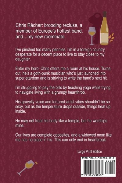 Chris Rächer: brooding recluse, a member of Europe's hottest band, and...my new roommate. I've pinched too many pennies. I'm in a foreign country, desperate for a decent place to live to stay close to my daughter. Enter my hero: Chris offers me a room at his house. Turns out, he's a goth-punk musician who's just launched into super-stardom and is striving to write the band's next hit. I'm struggling to pay the bills by teaching yoga while trying to navigate living with a grumpy heartthrob. His gravelly voice and tortured-artist vibes shouldn't be so sexy, but as the temperature drops outside, things heat up inside. He may not treat his body like a temple, but he worships mine. Our lives are complete opposites, and a widowed mom like me has no place in his. This can only end in heartbreak. Riesling with my Roommate is book two in the Aged Like Fine Wine series-women discovering that life gets hotter after forty. If you like relatable women, secret rockstars, and grumpy roommates, you'll love this one.