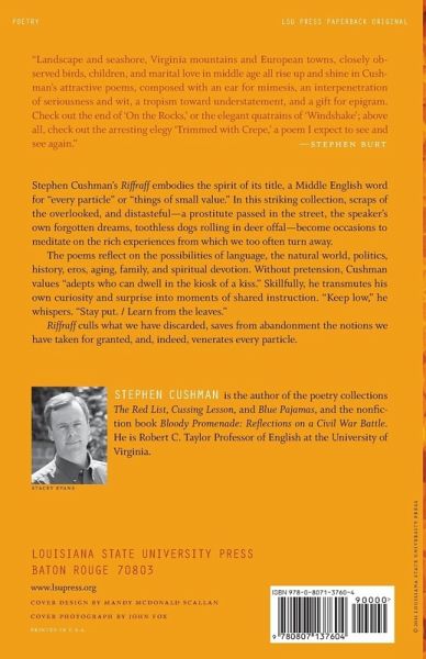 Stephen Cushman's Riffraff embodies the spirit of its title, a Middle English word for "every particle" or "things of small value." In this striking collection, scraps of the overlooked, and distasteful-a prostitute passed in the street, the speaker's own forgotten dreams, toothless dogs rolling in deer offal-become occasions to meditate on the rich experiences from which we too often turn away. The poems reflect on the possibilities of language, the natural world, politics, history, eros, aging, family, and spiritual devotion. Without pretension, Cushman values "adepts who can dwell in the kiosk of a kiss." Skillfully, he transmutes his own curiosity and surprise into moments of shared instruction. "Keep low," he whispers. "Stay put. / Learn from the leaves." Riffraff culls what we have discarded, saves from abandonment the notions we have taken for granted, and, indeed, venerates every particle.