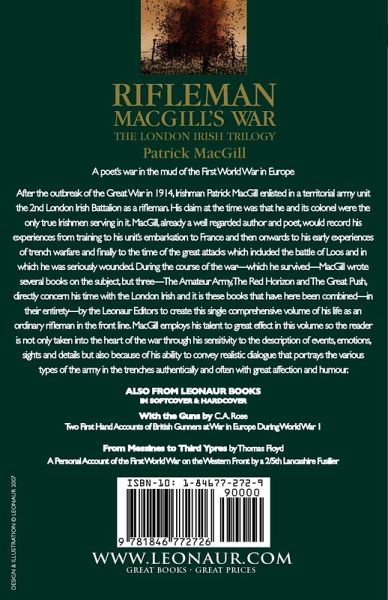 A poet's war in the mud of the First World War in Europe. After the outbreak of the Great War in 1914, Irishman Patrick MacGill enlisted in a territorial army unit the 2nd London Irish Battalion as a rifleman. His claim at the time was that he and its colonel were the only true Irishmen serving in it. MacGill, already a well regarded author and poet, would record his experiences from training to his unit's embarkation to France and then onwards to his early experiences of trench warfare and finally to the time of the great attacks which included the battle of Loos and in which he was seriously wounded. During the course of the war-which he survived-MacGill wrote several books on the subject, but three-The Amateur Army, The Red Horizon and The Great Push, directly concern his time with the London Irish and it is these books that have here been combined-in their entirety-by the Leonaur Editors to create this single comprehensive volume of his life as an ordinary rifleman in the front line. MacGill employs his talent to great effect in this volume so the reader is not only taken into the heart of the war through his sensitivity to the description of events, emotions, sights and details but also because of his ability to convey realistic dialogue that portrays the various types of the army in the trenches authentically and often with great affection and humour.