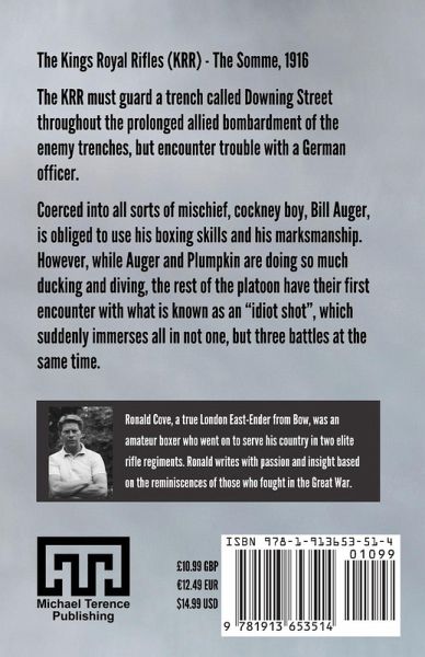 The Kings Royal Rifles (KRR) - The Somme, 1916...The KRR must guard a trench called Downing Street throughout the prolonged allied bombardment of the enemy trenches, but encounter trouble with a German officer. Coerced into all sorts of mischief, cockney boy, Bill Auger, is obliged to use his boxing skills and his marksmanship. However, while Auger and Plumpkin are doing so much ducking and diving, the rest of the platoon have their first encounter with what is known as an "idiot shot", which suddenly immerses all in not one, but three battles at the same time.