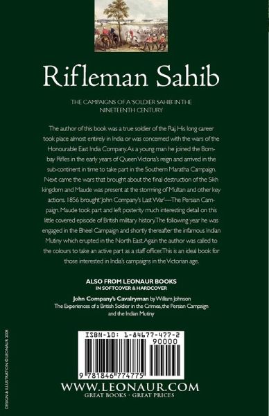 The campaigns of a 'soldier sahib' in the nineteenth century The author of this book was a true soldier of the Raj. His long career took place almost entirely in India or was concerned with the wars of the Honourable East India Company. As a young man he joined the Bombay Rifles in the early years of Queen Victoria's reign and arrived in the sub-continent in time to take part in the Southern Maratha Campaign. Next came the wars that brought about the final destruction of the Sikh kingdom and Maude was present at the storming of Multan and other key actions. 1856 brought 'John Company's Last War'-The Persian Campaign. Maude took part and left posterity much interesting detail on this little covered episode of British military history. The following year he was engaged in the Bheel Campaign and shortly thereafter the infamous Indian Mutiny which erupted in the North East. Again the author was called to the colours to take an active part as a staff officer. This is an ideal book for those interested in India's campaigns in the Victorian age.
