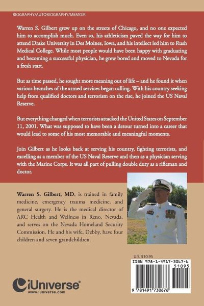 Warren S. Gilbert grew up on the streets of Chicago, and no one expected him to accomplish much. Even so, his athleticism paved the way for him to attend Drake University in Des Moines, Iowa, and his intellect led him to Rush Medical College. While most people would have been happy with graduating and becoming a successful physician, he grew bored and moved to Nevada for a fresh start. But as time passed, he sought more meaning out of life - and he found it when various branches of the armed services began calling. With his country seeking help from qualified doctors and terrorism on the rise, he joined the US Naval Reserve. But everything changed when terrorists attacked the United States on September 11, 2001. What was supposed to have been a detour turned into a career that would lead to some of his most memorable and meaningful moments. Join Gilbert as he looks back at serving his country, fighting terrorists, and excelling as a member of the US Naval Reserve and then as a physician serving with the Marine Corps. It was all part of pulling double duty as a rifleman and doctor.