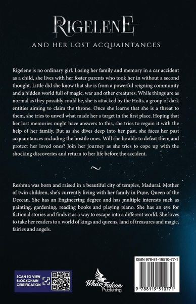 Rigelene is no ordinary girl. Losing her family and memory in a car accident as a child, she lives with her foster parents who took her in without a second thought. Little did she know that she is from a powerful reigning community and a hidden world full of magic, war and other creatures. While things are as normal as they possibly could be, she is attacked by the Holts, a group of dark entities aiming to claim the throne. Once she learns that she is a threat to them, she tries to unveil what made her a target in the first place. Hoping that her lost memories might have answers to this, she tries to regain it with the help of her family. But as she dives deep into her past, she faces her past acquaintances including the hostile ones. Will she be able to defeat them and protect her loved ones? Join her journey as she tries to cope up with the shocking discoveries and return to her life before the accident.