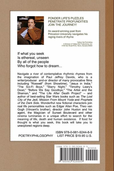 An award-winning poet from Princeton University and well-known film director and author (6 STARS WARS books) offers serious reflections on philosophical topics and famous people. Paul Jeffrey Davids is noted for his work in television (from THE TRANSFORMERS to Showtime's ROSWELL) and documentaries released by NBC Universal (JESUS IN INDIA, THE SCI-FI BOYS) and Universal's STARRY NIGHT. Here you will find his poems about Vincent van Gogh, Edgar Allan Poe, John Huston, Forrest J Ackerman, Ray Harryhausen and other cinema pioneers. Some poems delve into reincarnation, life after death, hauntings, love and despair, visions of the future and distant past, synchronicity, the meaning of life and death, and the poet's father (Prof. Jules Davids of Georgetown U.) and his mother. This completes his 2012 trilogy of poetry books, the other two being much lighter and filled with humor: POEMS TO READ WHILE DRIVING ON FREEWAYS (AND OTHER WAYS TO DIE LAUGHING) and POEMS TO READ WHEN YOU RUN OUT OF WEED.