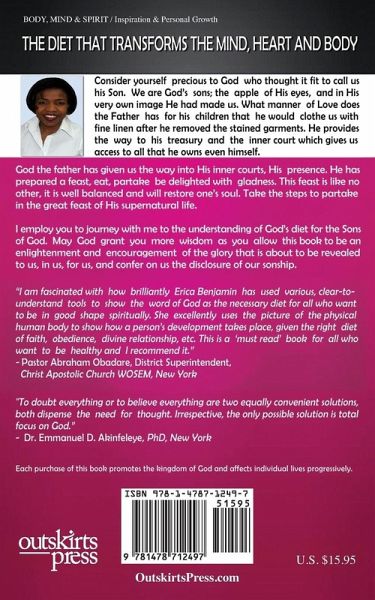 Consider yourself precious to God who thought it fit to call us his Son. We are God's sons; the apple of His eyes, and in His very own image He had made us. What manner of Love does the Father has for his children that he would clothe us with fine linen after he removed the stained garments. He provides the way to his treasury and the inner court which gives us access to all that he owns even himself. God the father has given us the way into his inner courts, his presence. He has prepared a feast, eat, partake be delighted with gladness. This feast is like no other, it is well balanced and it will restore one's soul. Take the steps to partake in the great feast of his supernatural life. I employ you to journey with me to the understanding of God's diet for the Sons of God. May God grant you more wisdom as you allow this book to be an enlightenment and encouragement of the glory that is about to be revealed to us, in us, for us, and confer on us the disclosure of our sonship. "I am fascinated with how brilliantly Erica Benjamin has used various, clear-to-understand tools to show the word of God as the necessary diet for all who want to be in good shape spiritually. She excellently uses the picture of the physical human body to show how a person's development takes place, given the right diet of faith, obedience, divine relationship, etc. This is a 'must read' book for all who want to be healthy and I recommend it." - Pastor Abraham Obadare, District Superintendent, Christ Apostolic Church WOSEM, New York - "To doubt everything or to believe everything are two equally convenient solutions, both dispense the need for thought. Irrespective, the only possible solution is total focus on God." - Dr. Emmanuel D. Akinfeleye, PhD, New York Each purchase of this book promotes the kingdom of God and affects individual lives progressively.