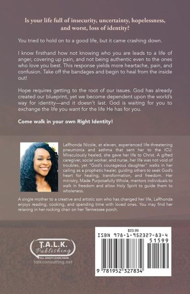You tried to hold on to a good life, but it came crashing down. I know firsthand how not knowing who you are leads to a life of anger, covering up pain, and not being authentic even to the ones who love you best. This response yields more heartache, pain, and confusion. Take off the bandages and begin to heal from the inside out! Hope requires getting to the root of our issues. God has already created our blueprint, yet we become dependent upon the world's way of identity and it doesn't last. God is waiting for you to exchange the life you want for the life He has for you, Come walk in your own Right Identity!