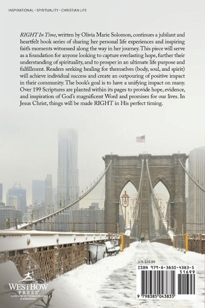RIGHT In Time, written by Olivia Marie Solomon, continues a jubilant and heartfelt book series of sharing her personal life experiences and inspiring faith moments witnessed along the way in her journey. This piece will serve as a foundation for anyone looking to capture everlasting hope, further their understanding of spirituality, and to prosper in an ultimate life purpose and fulfillment. Readers seeking healing for themselves (body, soul, and spirit) will achieve individual success and create an outpouring of positive impact in their community. The book's goal is to have a unifying impact on many. Over 199 Scriptures are planted within its pages to provide hope, evidence, and inspiration of God's magnificent Word and promises for our lives. In Jesus Christ, things will be made RIGHT in His perfect timing.