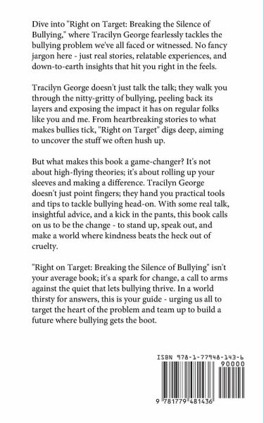 Dive into "Right on Target: Breaking the Silence of Bullying," where Tracilyn George fearlessly tackles the bullying problem we've all faced or witnessed. No fancy jargon here - just real stories, relatable experiences, and down-to-earth insights that hit you right in the feels. Tracilyn George doesn't just talk the talk; they walk you through the nitty-gritty of bullying, peeling back its layers and exposing the impact it has on regular folks like you and me. From heartbreaking stories to what makes bullies tick, "Right on Target" digs deep, aiming to uncover the stuff we often hush up. But what makes this book a game-changer? It's not about high-flying theories; it's about rolling up your sleeves and making a difference. Tracilyn George doesn't just point fingers; they hand you practical tools and tips to tackle bullying head-on. With some real talk, insightful advice, and a kick in the pants, this book calls on us to be the change - to stand up, speak out, and make a world where kindness beats the heck out of cruelty. "Right on Target: Breaking the Silence of Bullying" isn't your average book; it's a spark for change, a call to arms against the quiet that lets bullying thrive. In a world thirsty for answers, this is your guide - urging us all to target the heart of the problem and team up to build a future where bullying gets the boot.