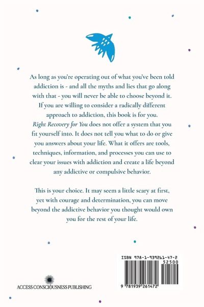 As long as you're operating out of what you've been told addiction is -and all the myths and lies that go along with that- you will never be able to choose beyond it. If you are willing to consider a radically different approach to addiction, this book is for you. Right Recovery for You does not offer a system that you fit yourself into. It does not tell you what to do or give you answers about your life. What it offers are tools, techniques, information, and processes you can use to clear your issues with addiction and create a life beyond any addictive or compulsive behavior. This is your choice. It may seem a little scary at first, yet with courage and determination, you can move beyond the addictive behavior you thought would own you for the rest of your life.