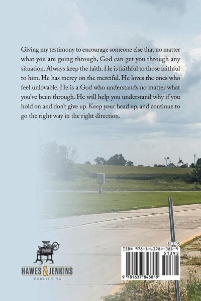 Giving my testimony to encourage someone else that no matter what you are going through, God can get you through any situation. Always keep the faith. He is faithful to those faithful to him. He has mercy on the merciful. He loves the ones who feel unlovable. He is a God who understands no matter what you've been through. He will help you understand why if you hold on and don't give up. Keep your head up, and continue to go the right way in the right direction.