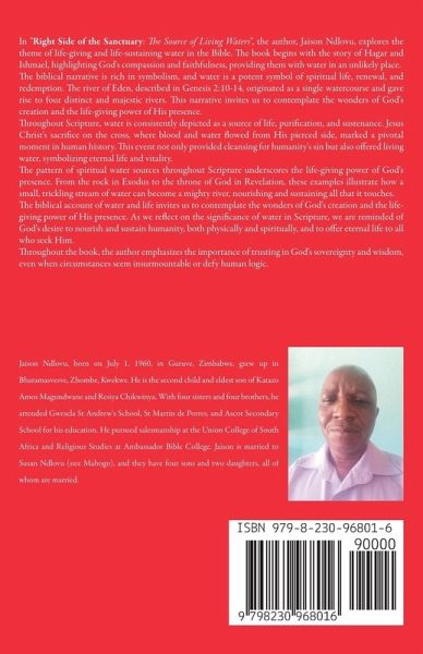 The book "Right Side of the Sanctuary: The Source of Living Waters" by Jaison Ndlovu explores the theme of life-giving and life-sustaining water in the Bible. It begins with the story of Hagar and Ishmael, highlighting God's compassion and faithfulness, providing them with water in an unlikely place. The book then delves into Isaiah 55:1, where those who thirst are invited to come to the waters and buy wine and milk without money or price, symbolizing spiritual nourishment and redemption. Other chapters examine the biblical accounts of Elisha and the kings, Moses and the rock, and the Tree of Life, all of which illustrate the life-giving and restorative power of God's presence. The book also explores Jesus' promise of living water in John 4 and the symbolism of the river of Eden and the Jordan River as representations of God's life-giving presence and provision. Throughout the book, the author emphasizes the importance of trusting in God's sovereignty and wisdom, even when circumstances seem insurmountable or defy human logic.