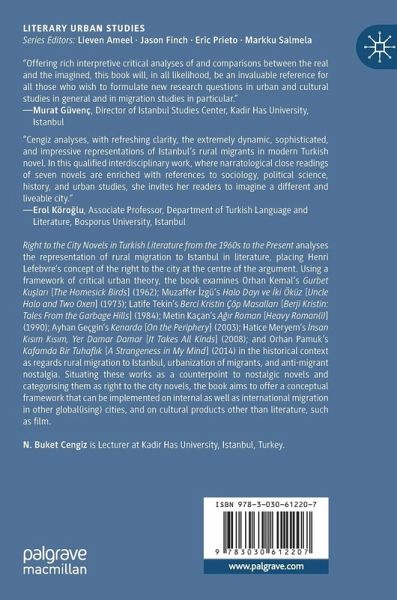 Right to the City Novels in Turkish Literature from the 1960s to the Present analyses the representation of rural migration to Istanbul in literature, placing Henri Lefebvre's concept of the right to the city at the centre of the argument. Using a framework of critical urban theory, the book examines Orhan Kemal's Gurbet Kuslari [The Homesick Birds] (1962); Muzaffer Izgü's Halo Dayi ve Iki Öküz [Uncle Halo and Two Oxen] (1973); Latife Tekin's Berci Kristin Çöp Masallari [Berji Kristin: Tales From the Garbage Hills] (1984); Metin Kaçan's Agir Roman [Heavy Roman(i)] (1990); Ayhan Geçgin's Kenarda [On the Periphery] (2003); Hatice Meryem's Insan Kisim Kisim, Yer Damar Damar [It Takes All Kinds] (2008); and Orhan Pamuk's Kafamda Bir Tuhaflik [A Strangeness in My Mind] (2014) in the historical context as regards rural migration to Istanbul, urbanization of migrants, and anti-migrant nostalgia. Situating these works as a counterpoint to nostalgic novels and categorising them as right to the city novels, the book aims to offer a conceptual framework that can be implemented on internal as well as international migration in other global(ising) cities; and on cultural products other than literature, such as film.
