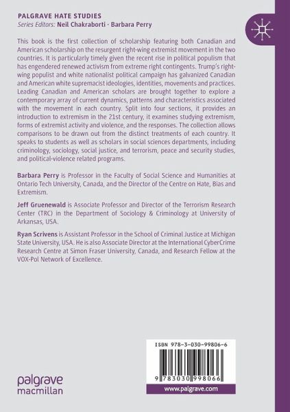 Part 1. Thinking About Right-wing Extremism in North America.- Chapter 1. Introduction (Barbara Perry, Jeffrey Greunewald, Ryan Scrivens).- Chapter 2. Understanding Extremism: Frames of Analysis of the Far Right (Randy Blazak).- Chapter 3. Blurring the Boundaries of Mainstream and Extreme: Contexts and Contours of Right-wing Extremism in Canada (Barbara Perry).- Chapter 4. Trump and the Alt Right: The Mainstreaming of White Nationalism (Tanner Mirrlees).- Chapter 5. Asymmetric Coverage of Asymmetric Violence: How the U.S. Print News Media Report Far Right Terrorism (Erin M. Kearns and Allison Betus).- Chapter 6. Check All That Apply: Challenges in Tracking Ideological Movements That Motivate Far-Right Terrorism (Erin Miller, Elizabeth Yates, and Sheehan Kane).- Part 2. Diversity Within the Right-wing Extremist Movement.- Chapter 7. 'We Are the News Now': The Role of Networked Conspiracy and the Quebec 'Tweetosphere' in Shaping the Narrative around the Anti-COVID-19 Restrictions (Samuel Tanner and Aurélie Campana).- Chapter 8. By Ballot or by Bullet: Fantasies of Violence in the Patriot/Militia Movement in the United States (Sam Jackson).- Chapter 9. Birds of a feather: A comparative analysis of white supremacist and violent male supremacist discourses (Meredith Pruden, Ayse Lokmanoglu, Anne Peterscheck, and Dr Yannick Veilleux-Lepage).- Chapter 10. They're not all the same: a longitudinal comparison of violent and non-violent right-wing identities (Garth Davies, Ryan Scrivens, Tiana Gaudette, and Richard Frank).- Chapter 11. No Longer Alone: Lone Wolves, Wolf Packs and Made for Web TV Specials (Jeffrey Kaplan).- Part 3. Where the Action Is: Right-wing Extremist Activities.- Chapter 12. Far Right Extremist Violence in the United States (Steven Chermak, Joshua Freilich, , William Parkin, Jeff Gruenewald, Colleen Mills, Brent Klein, Leevia Dillon, and Celinet Duran).- Chapter 13. Pathways to Hate: Applyingan Integrated Social Control-Social Learning Model to Hate Violence by Far-Right Extremists (Colleen Mills).- Chapter 14. Far-Right Extremists' Use of the Internet: Emerging Trends in the Empirical Literature (Ryan Scrivens, Tiana Gaudette, Maura Conway, and Thomas J. Holt).- Chapter 15. Far-Right Violence and Extremism - Global Convergence(Arie Perliger and Michael Mills).- Chapter 16. The Nexus of Right-Wing Extremism and the Canadian Armed Forces (Philip McCristall, David C. Hofmann, and Shayna Perry).- Part 4. Responses to far-right extremism.- Chapter 17. More than Walking Away: Barriers to Disengagement among Former White Supremacists (Steven Windisch, Pete Simi, Kathleen Blee, and Matthew DeMichele ).- Chapter 18. Confronting Online Extremism: Strategies, Promises, and Pitfalls (James Hawdon and Matthew Costello).- 19. Criminal Justice Responses To Right-Wing Extremist Violence In The United States (Jeff Gruenewald, Katie Ratcliff, and Hayden Lucas).