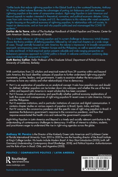 "Unlike books that reduce rightwing populism in the global south to a few scattered footnotes, Antony Pereira's edited volume illustrates the advantages of putting Jair Bolsonaro and Latin American rightwing populism at the center of comparative analysis. Right-wing Populism in Latin American and Beyond appeals to readers interested in theoretical, normative, and political-economic debates. Using cases from Latin America, Asia, Europe, and U.S. the contributors to this volume offer novel conceptual insights focusing on the political economy of rightwing populism, its relationships with civil society, its impact on democracies, and on how and why populists politicized and mismanaged the COVID 19 epidemic."