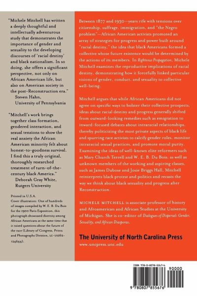 Between 1877 and 1930 - years rife with tensions over citizenship, suffrage, immigration, and ""the Negro problem"" - African American activists promoted an array of strategies for progress and power built around ""racial destiny,"" the idea that black Americans formed a collective whose future existence would be determined by the actions of its members. In Righteous Propagation, Michele Mitchell examines the reproductive implications of racial destiny, demonstrating how it forcefully linked particular visions of gender, conduct, and sexuality to collective well-being. Mitchell argues that while African Americans did not agree on specific ways to bolster their collective prospects, ideas about racial destiny and progress generally shifted from outward-looking remedies such as emigration to inward-focused debates about intraracial relationships, thereby politicizing the most private aspects of black life and spurring race activists to calcify gender roles, monitor intraracial sexual practices, and promote moral purity. Examining the ideas of well-known elite reformers such as Mary Church Terrell and W. E. B. DuBois, as well as unknown members of the working and aspiring classes, such as James Dubose and Josie Briggs Hall, Mitchell reinterprets black protest and politics and recasts the way we think about black sexuality and progress after Reconstruction.
