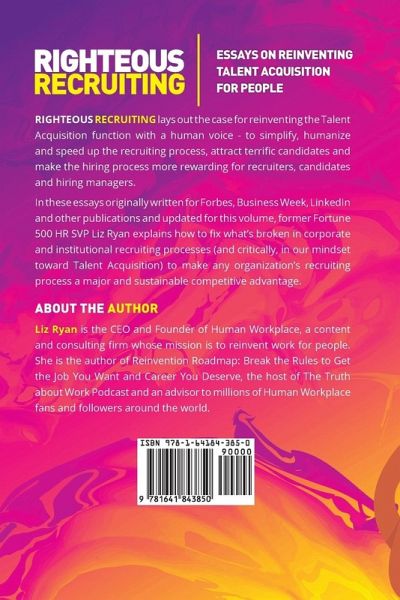 The field of talent acquisition is ripe for reinvention. In Righteous Recruiting: Essays on Reinventing Talent Acquisition for People, Liz Ryan - CEO of Human Workplace, a former Fortune 500 HR Senior VP and the world's most widely read career and HR advisor - lays out a practical, attainable vision for that reinvention. In essays on recruiting topics ranging from how to write a compelling job ad to how to deal with a client's unrealistic expectations or engage a passive candidate, Ryan lays out a people-centric talent acquisition mindset and practices that any organization can adopt. Making even small changes in candidate communication, process and above all, recruiting philosophy as outlined in Righteous Recruiting will let employers create the only sustainable competitive advantage there is - the ability to attract and retain amazing people.