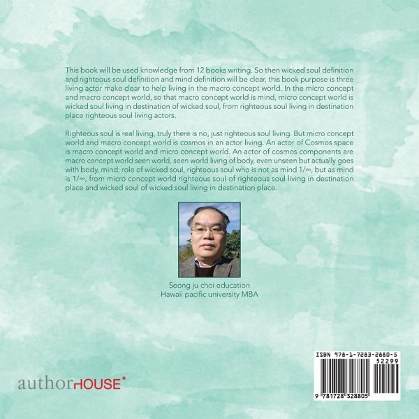This book will be used knowledge from 12 books writing. So then wicked soul definition and righteous soul definition and mind definition will be clear, this book purpose is three living actor make clear to help living in the macro concept world. In the micro concept and macro concept world, so that macro concept world is mind, micro concept world is wicked soul living in destination of wicked soul, from righteous soul living in destination place righteous soul living actors. Righteous soul is real living, truly there is no, just righteous soul living. But micro concept world and macro concept world is cosmos in an actor living. An actor of Cosmos space is macro concept world and micro concept world. An actor of cosmos components are macro concept world seen world, seen world living of body, even unseen but actually goes with body, mind; role of wicked soul, righteous soul who is not as mind 1/, but as mind is 1/, from micro concept world righteous soul of righteous soul living in destination place and wicked soul of wicked soul living in destination place.