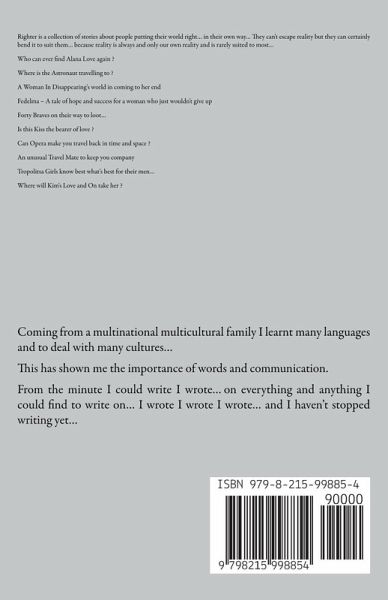 Righter is a collection of stories about people putting their world right… in their own way… They can't escape reality but they can certainly bend it to suit them… because reality is always and only our own reality and is rarely suited to most… Who can ever find Alana Love again ? Where is the Astronaut travelling to ? A Woman In Disappearing's world in coming to her end Fedelma – A tale of hope and success for a woman who just wouldn't give up Forty Braves on their way to loot… Is this Kiss the bearer of love ? Can Opera make you travel back in time and space ? An unusual Travel Mate to keep you company Tropolitsa Girls know best what's best for their men… Where will Kim's Love and On take her ?