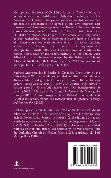 Metropolitan Kallistos of Diokleia, formerly Timothy Ware, is unquestionably the best-known Orthodox theologian in the Western world today. The papers collected in this volume are designed to demonstrate the spread of his own interests and concerns and therefore range from the Desert Fathers to modern church dialogue, from patristics to church music, from the Philokalia to human "priesthood". In the course of a long career he has touched the lives of many people and there is a section of tributes concerned with his role as spiritual father, teacher, writer, pastor, theologian, and monk. In the epilogue the Metropolitan himself reflects on his many years as a pilgrim to Mount Athos. Most of the papers included in this volume were delivered at a conference convened by the Friends of Mount Athos at Madingley Hall, Cambridge, in 2015 in honour of Metropolitan Kallistos's eightieth birthday.