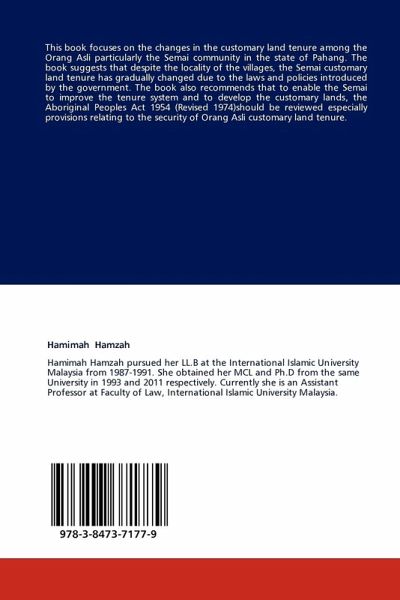 This book focuses on the changes in the customary land tenure among the Orang Asli particularly the Semai community in the state of Pahang. The book suggests that despite the locality of the villages, the Semai customary land tenure has gradually changed due to the laws and policies introduced by the government. The book also recommends that to enable the Semai to improve the tenure system and to develop the customary lands, the Aboriginal Peoples Act 1954 (Revised 1974)should be reviewed especially provisions relating to the security of Orang Asli customary land tenure.