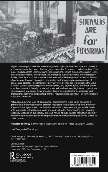 Rights of Passage: Sidewalks and the Regulation of Public Flow documents a powerful and under-researched form of urban governance that focuses on pedestrian flow. This logic, which Nicholas Blomley terms 'pedestrianism', values public space not in terms of its aesthetic merits, or its success in promoting public citizenship and democracy. Rather, the function of the sidewalk is understood to be the promotion and facilitation of pedestrian flow and circulation, predicated on the appropriate arrangement of people and objects. This remarkably pervasive yet overlooked logic shapes the ways in which public space is regulated, conceived of, and argued about. Rights of Passage shows how the sidewalk is literally produced, encoded, rendered legible and operational with reference to a dense array of codes, diagrams, specifications, academic and professional networks, engineering rubrics, regulation and case law - all in the name of unfettered circulation. Although a powerful form of governance, pedestrianism tends to be obscured by grander and more visible forms of urban regulation. The rationality at work here may appear commonplace; but, precisely because it is uncontroversial, pedestrianism is able to operate below the academic and political radar. Complicating the prevailing tendency to focus on the socially directive nature of public space regulation, Blomley reveals the particular ways in which pedestrianism deactivates rights-based claims to public space.