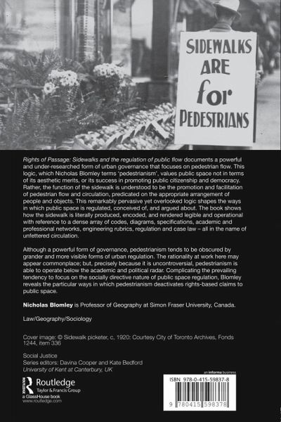 Rights of Passage: Sidewalks and the Regulation of Public Flow documents a powerful and under-researched form of urban governance that focuses on pedestrian flow. This logic, which Nicholas Blomley terms 'pedestrianism', values public space not in terms of its aesthetic merits, or its success in promoting public citizenship and democracy. Rather, the function of the sidewalk is understood to be the promotion and facilitation of pedestrian flow and circulation, predicated on the appropriate arrangement of people and objects. This remarkably pervasive yet overlooked logic shapes the ways in which public space is regulated, conceived of, and argued about. Rights of Passage shows how the sidewalk is literally produced, encoded, rendered legible and operational with reference to a dense array of codes, diagrams, specifications, academic and professional networks, engineering rubrics, regulation and case law - all in the name of unfettered circulation. Although a powerful form of governance, pedestrianism tends to be obscured by grander and more visible forms of urban regulation. The rationality at work here may appear commonplace; but, precisely because it is uncontroversial, pedestrianism is able to operate below the academic and political radar. Complicating the prevailing tendency to focus on the socially directive nature of public space regulation, Blomley reveals the particular ways in which pedestrianism deactivates rights-based claims to public space.