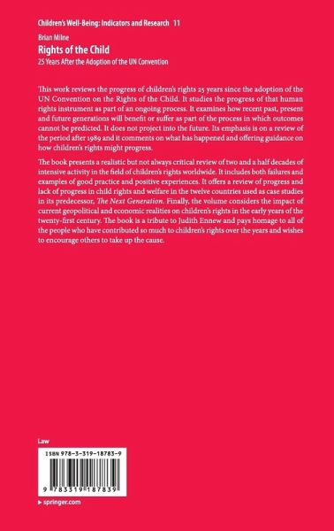 This work reviews the progress of children's rights 25 years since the adoption of the UN Convention on the Rights of the Child. It studies the progress of that human rights instrument as part of an ongoing process. It examines how recent past, present and future generations will benefit or suffer as part of the process in which outcomes cannot be predicted. It does not project into the future. Its emphasis is on a review of the period after 1989 and it comments on what has happened and offering guidance on how children's rights might progress.