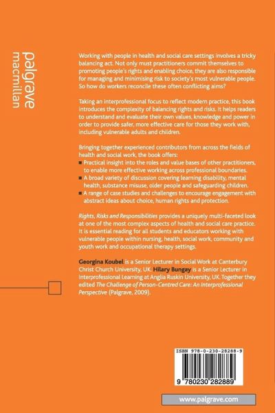 Introduction PART I: CRITICAL CONCEPTS Constructing Risk and Responsibilities in an Age of Uncertainty; A.Adams Rights and Responsibilities; P.Ellis Managing Risk in a Complex Society; C.Yardley & G.Koubel Risk v. Benefit: Understanding the Individual's Decision-making Process; H.Bungay PART II: CONCEPTS INTO PRACTICE Working with People with Profound and Intellectual and Multiple Disabilities; C.Bernal & A.Nazarjuk Working with Problem Drinkers and Drug Users; B.Cecil Taking Relationships into Account in Mental Health Care; J.Melville-Wiseman Managing Risk and Interprofessional Responsibilities in Safeguarding Children; C.Yardley & J.Greaves Health and Social Care in the Community: Wellbeing, Independence, Risk, Rights and Vulnerablity; J.Arnott & G.Koubel PART III: CHALLENGES FOR PROFESSIONALS Responsibilities and Accountabilities in Interprofessional Working; H.Colyer Critical Reflection in Balancing Rights, Risks and Responsibilities; G.Koubel Conclusion; G.Koubel