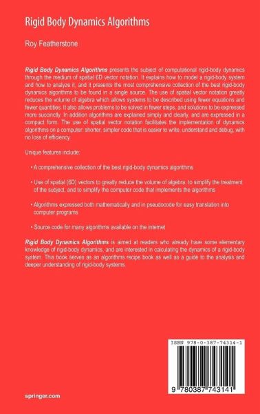 and how to analyze it, and it presents the most comprehensive collection of the best rigid-body dynamics algorithms to be found in a single source. The use of spatial vector notation greatly reduces the volume of algebra which allows systems to be described using fewer equations and fewer quantities. It also allows problems to be solved in fewer steps, and solutions to be expressed more succinctly. In addition algorithms are explained simply and clearly, and are expressed in a compact form. The use of spatial vector notation facilitates the implementation of dynamics algorithms on a computer: shorter, simpler code that is easier to write, understand and debug, with no loss of efficiency.