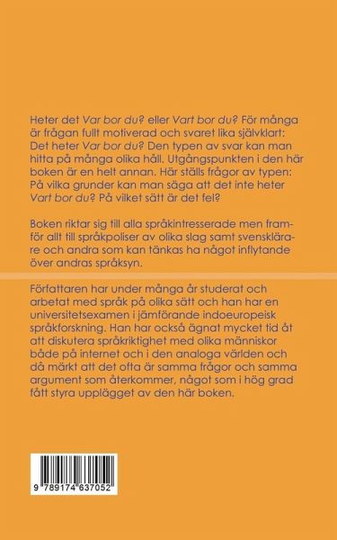 Heter det Var bor du? eller Vart bor du? För många är frågan fullt motiverad och svaret lika självklart: Det heter Var bor du? Den typen av svar kan man hitta på många olika håll. Utgångspunkten i den här boken är en helt annan. Här ställs frågor av typen: På vilka grunder kan man säga att det inte heter Vart bor du? På vilket sätt är det fel?