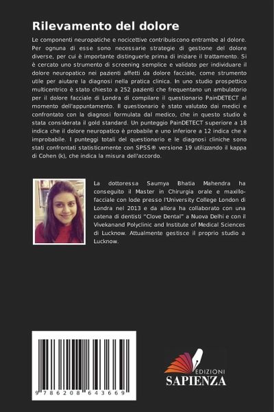 Le componenti neuropatiche e nocicettive contribuiscono entrambe al dolore. Per ognuna di esse sono necessarie strategie di gestione del dolore diverse, per cui è importante distinguerle prima di iniziare il trattamento. Si è cercato uno strumento di screening semplice e validato per individuare il dolore neuropatico nei pazienti affetti da dolore facciale, come strumento utile per aiutare la diagnosi nella pratica clinica. In uno studio prospettico multicentrico è stato chiesto a 252 pazienti che frequentano un ambulatorio per il dolore facciale di Londra di compilare il questionario PainDETECT al momento dell'appuntamento. Il questionario è stato valutato dai medici e confrontato con la diagnosi formulata dal medico, che in questo studio è stata considerata il gold standard. Un punteggio PainDETECT superiore a 18 indica che il dolore neuropatico è probabile e uno inferiore a 12 indica che è improbabile. I punteggi totali del questionario e le diagnosi cliniche sono stati confrontati statisticamente con SPSS® versione 19 utilizzando il kappa di Cohen (k), che indica la misura dell'accordo.