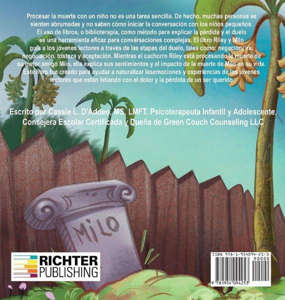 Procesar la muerte con un niño no es una tarea sencilla. De hecho, muchas personas se sienten abrumadas y no saben cómo iniciar la conversación con los niños pequeños. El uso de libros, o biblioterapia, como método para explicar la pérdida y el duelo es una herramienta eficaz para conversaciones complejas. El libro Riley y Milo guía a los jóvenes lectores a través de las etapas del duelo, tales como: negación, ira, negociación, tristeza y aceptación. Mientras el cachorro Riley está procesando la muerte de su mejor amigo Milo, ella explica sus sentimientos y el impacto de la muerte de Milo en su vida. Este libro fue creado para ayudar a naturalizar lasemociones y experiencias de los jóvenes lectores que están lidiando con el dolor y la pérdida de un ser querido. Escrito por Cassie L. D'Addeo, MS, LMFT. Psicoterapeuta Infantil y Adolescente, Consejera Escolar Certificada y Dueña de Green Couch Counseling LLC