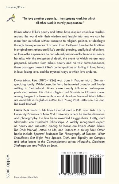 Rainer Maria Rilke’s poetry and letters have inspired countless readers around the world with their wisdom and insight into how we can be more than ourselves without recourse to religion, politics, or ideology: through the experiences of art and love. Gathered here for the first time in original translations are Rilke’s candid, piercing, and lyrical reflections on love—the experience he considered paramount for human existence but also, with the exception of death, the event for which we are least prepared. Selected from Rilke’s poetry and his vast correspondence, these passages present Rilke’s contemplations on falling in love, being in love, losing love, and the mystical ways in which love endures.