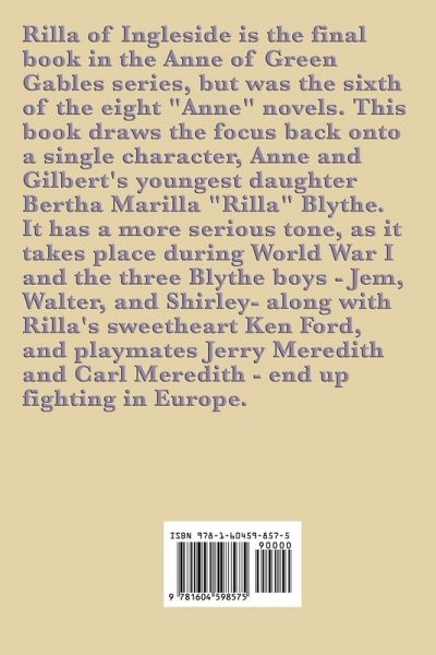 Rilla of Ingleside is the final book in the Anne of Green Gables series, but was the sixth of the eight "Anne" novels. This book draws the focus back onto a single character, Anne and Gilbert's youngest daughter Bertha Marilla "Rilla" Blythe. It has a more serious tone, as it takes place during World War I and the three Blythe boys - Jem, Walter, and Shirley- along with Rilla's sweetheart Ken Ford, and playmates Jerry Meredith and Carl Meredith - end up fighting in Europe.
