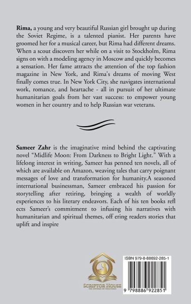 Rima, a young and very beautiful Russian girl brought up during the Soviet Regime, is a talented pianist. Her parents have groomed her for a musical career, but Rima had different dreams. When a scout discovers her while on a visit to Stockholm, Rima signs on with a modeling agency in Moscow and quickly becomes a sensation. Her fame attracts the attention of the top fashion magazine in New York, and Rima's dreams of moving West finally comes true. In New York City, she navigates international work, romance, and heartache - all in pursuit of her ultimate humanitarian goals from her vast success: to empower young women in her country and to help Russian war veterans. -------- Sameer Zahr is the imaginative mind behind the captivating novel "Midlife Moon: From Darkness to Bright Light." With a lifelong interest in writing, Sameer has penned ten novels, all of which are available on Amazon, weaving tales that carry poignant messages of love and transformation for humanity.A seasoned international businessman, Sameer embraced his passion for storytelling after retiring, bringing a wealth of worldly experiences to his literary endeavors. Each of his ten books refl ects Sameer's commitment to infusing his narratives with humanitarian and spiritual themes, off ering readers stories that uplift and inspire