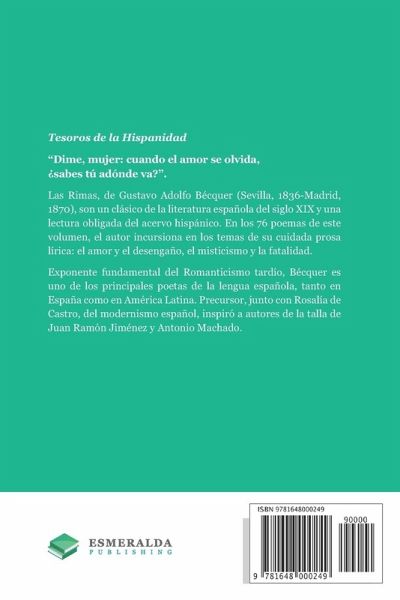 Tesoros de la Hispanidad "Dime, mujer: cuando el amor se olvida, ¿sabes tú adónde va?". Las Rimas, de Gustavo Adolfo Bécquer (Sevilla, 1836-Madrid, 1870), son un clásico de la literatura española del siglo XIX y una lectura obligada del acervo hispánico. En los 76 poemas de este volumen, el autor incursiona en los temas de su cuidada prosa lírica: el amor y el desengaño, el misticismo y la fatalidad. Exponente fundamental del Romanticismo tardío, Bécquer es uno de los principales poetas de la lengua española, tanto en España como en América Latina. Precursor, junto con Rosalía de Castro, del modernismo español, inspiró a autores de la talla de Juan Ramón Jiménez y Antonio Machado. A master of late Romanticism, Gustavo Adolfo Bécquer (Spain, 1836-1870) is one of the most famous and celebrated authors across Spain and Latin America. His works (including Leyendas and Rimas) have been best sellers since their original publication in the 19th century. A precursor, with Rosalía de Castro, of Spanish Modernism, his natural style influenced Antonio Machado and Juan Ramón Jiménez, among others. Rimas includes 76 poems published between 1859 and 1870, and is a classic of Spanish literature. Bécquer's poetry is colorful and vibrant but modern and clear, making it a great choice for readers with a good command of the language.