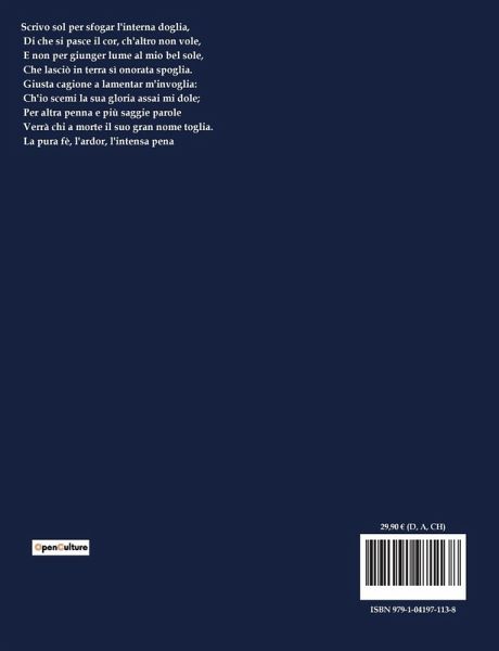 Scrivo sol per sfogar l'interna doglia, Di che si pasce il cor, ch'altro non vole, E non per giunger lume al mio bel sole, Che lasciò in terra sì onorata spoglia. Giusta cagione a lamentar m'invoglia: Ch'io scemi la sua gloria assai mi dole; Per altra penna e più saggie parole Verrà chi a morte il suo gran nome toglia. La pura fè, l'ardor, l'intensa pena