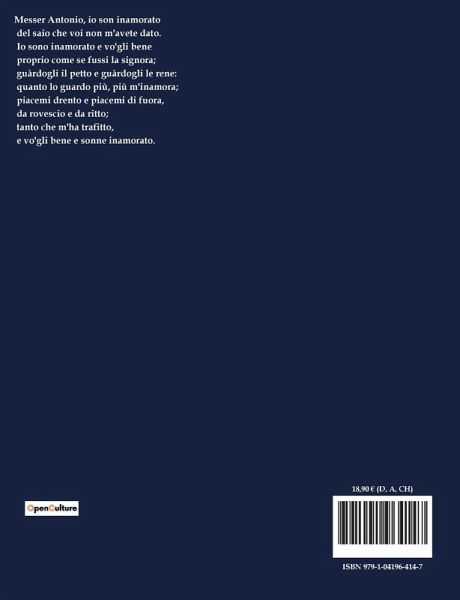 Messer Antonio, io son inamorato del saio che voi non m'avete dato. Io sono inamorato e vo'gli bene proprio come se fussi la signora; guàrdogli il petto e guàrdogli le rene: quanto lo guardo più, più m'inamora; piacemi drento e piacemi di fuora, da rovescio e da ritto; tanto che m'ha trafitto, e vo'gli bene e sonne inamorato.