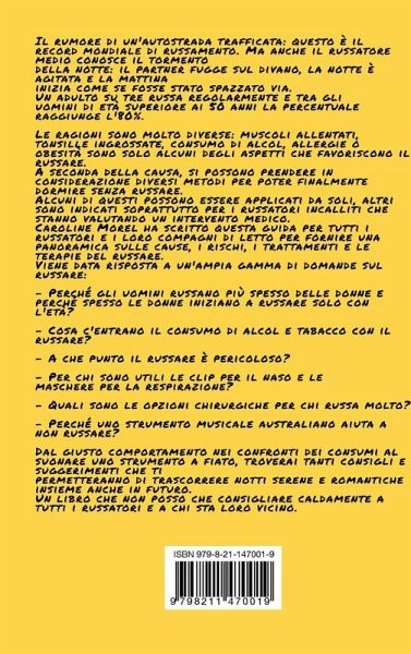 Il rumore di un'autostrada trafficata: questo è il record mondiale di russamento. Ma anche il russatore medio conosce il tormento della notte: il partner fugge sul divano, la notte è agitata e la mattina inizia come se fosse stato spazzato via. Un adulto su tre russa regolarmente e tra gli uomini di età superiore ai 50 anni la percentuale raggiunge l'80 per cento. Le ragioni sono molto diverse: muscoli allentati, tonsille ingrossate, consumo di alcol, allergie o obesità sono solo alcuni degli aspetti che favoriscono il russare. A seconda della causa, si possono prendere in considerazione diversi metodi per poter finalmente dormire senza russare. Alcuni di questi possono essere applicati da soli, altri sono indicati soprattutto per i russatori incalliti che stanno valutando un intervento medico. Caroline Morel ha scritto questa guida per tutti i russatori e i loro compagni di letto per fornire una panoramica sulle cause, i rischi, i trattamenti e le terapie del russare. Viene data risposta a un'ampia gamma di domande sul russare: - Perché gli uomini russano più spesso delle donne e perché spesso le donne iniziano a russare solo con l'età? - Cosa c'entrano il consumo di alcol e tabacco con il russare? - A che punto il russare è pericoloso? - Per chi sono utili le clip per il naso e le maschere per la respirazione? - Quali sono le opzioni chirurgiche per chi russa molto? - Perché uno strumento musicale australiano aiuta a non russare? Dal giusto comportamento nei confronti dei consumi al suonare uno strumento a fiato, troverai tanti consigli e suggerimenti che ti permetteranno di trascorrere notti serene e romantiche insieme anche in futuro. Un libro che non posso che consigliare caldamente a tutti i russatori e a chi sta loro vicino!