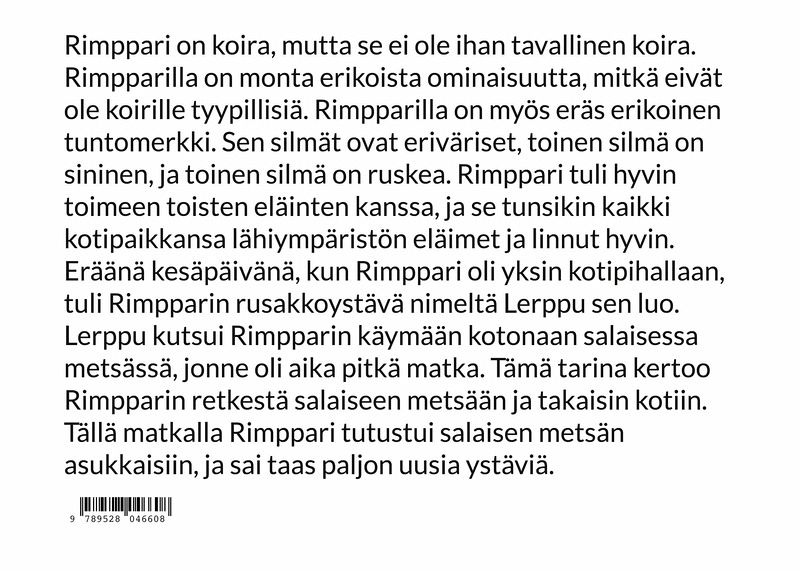 Rimppari on koira, mutta se ei ole ihan tavallinen koira. Rimpparilla on monia erikoisia ominaisuuksia, mitkä eivät ole koirille tyypillisiä. Rimpparilla on myös eräs erikoinen tuntomerkki. Sen silmät ovat eriväriset, toinen silmä on sininen, ja toinen silmä on ruskea. Rimppari tuli hyvin toimeen toisten eläinten kanssa, ja se tunsikin kaikki kotipaikkansa lähiympäristön eläimet ja linnut hyvin. Eräänä kesäpäivänä, kun Rimppari oli yksin kotipihallaan, tuli Rimpparin rusakkoystävä nimeltä Lerppu sen luo. Lerppu kutsui Rimpparin käymään kotonaan salaisessa metsässä, jonne oli aika pitkä matka. Tämä tarina kertoo Rimpparin retkestä salaiseen metsään ja takaisin kotiin. Tällä matkalla Rimppari tutustui salaisen metsän asukkaisiin, ja sai taas paljon uusia ystäviä.