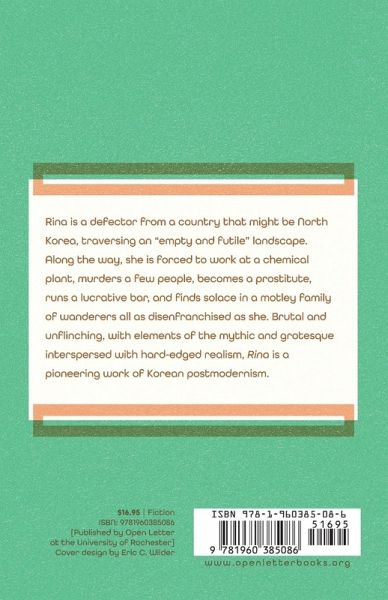 "Rina is a defector from a country that might be North Korea, traversing an "empty and futile" landscape. Along the way, she is forced to work at a chemical plant, murders a few people, becomes a prostitute, runs a lucrative bar, and finds a solace in a motley family of wanderers all as disenfranchised as she. Brutal and unflinching, with elements of the mythic and grotesque interspersed with hard-edged realism, Rina is a pioneering work of Korean postmodernism"--