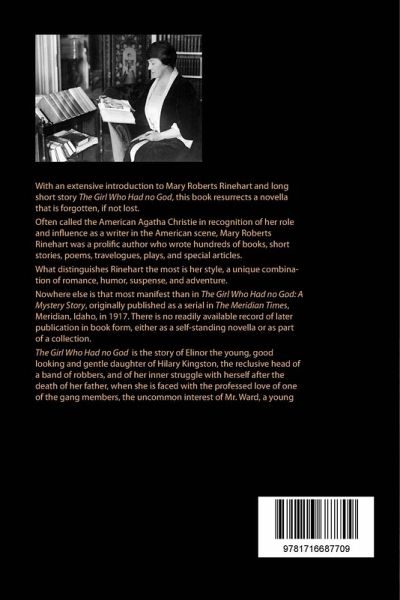 With an extensive introduction to Mary Roberts Rinehart and the long short story "The Girl Who Had no God," this eBook resurrects a novella that is forgotten, if not lost. Often called the American Agatha Christie in recognition of her role and influence as a writer in the American scene, Mary Roberts Rinehart was a prolific author who wrote hundreds of books, short stories, poems, travelogues, plays, and special articles. What distinguishes Rinehart the most is her style, a unique combination of romance, humor, suspense, and adventure. Nowhere else is that most manifest than in "The Girl Who Had no God: A Mystery Story," originally published as a serial in "The Meridian Times," Meridian, Idaho, in 1917. There is no readily available record of later publication in book form, either as a self-standing novella or as part of a collection. "The Girl Who Had no God" is the story of Elinor the young, good looking and gentle daughter of Hilary Kingston, the reclusive head of a band of robbers, and of her inner struggle with herself after the death of her father, when she is faced with the professed love of one of the gang members, the uncommon interest of Mr. Ward, a young bachelor and clergyman, and the actions of a band she now leads.