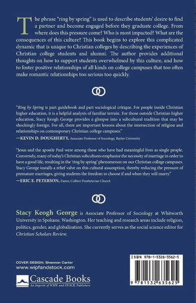 The phrase ""ring by spring"" is used to describe students' desire to find a partner and become engaged before they graduate college. From where does this pressure come? Who is most impacted? What are the consequences of this culture? This book begins to explore this complicated dynamic that is unique to Christian colleges by describing the experiences of Christian college students and alumni. The author provides additional thoughts on how to support students overwhelmed by this culture, and how to foster positive relationships of all kinds on college campuses that too often make romantic relationships too serious too quickly.