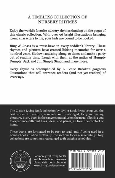 Find the world's favorite nursery rhymes dancing on the pages in this classic collection! With over 96 bright illustrations bringing iconic characters to life, your kids are bound to be hooked. Ring o' Roses is a must-have in every toddler's library! These rhymes and pictures have created lifelong memories for over a hundred years. Sit down and sing-along, or dance and make a party out of reading time. Laugh with them at the antics of Humpty Dumpty, Jack and Jill, Simple Simon and many more. Every rhyme is accompanied by L. Leslie Brooke's gorgeous illustrations that will entrance readers (and not-yet-readers) of every age.